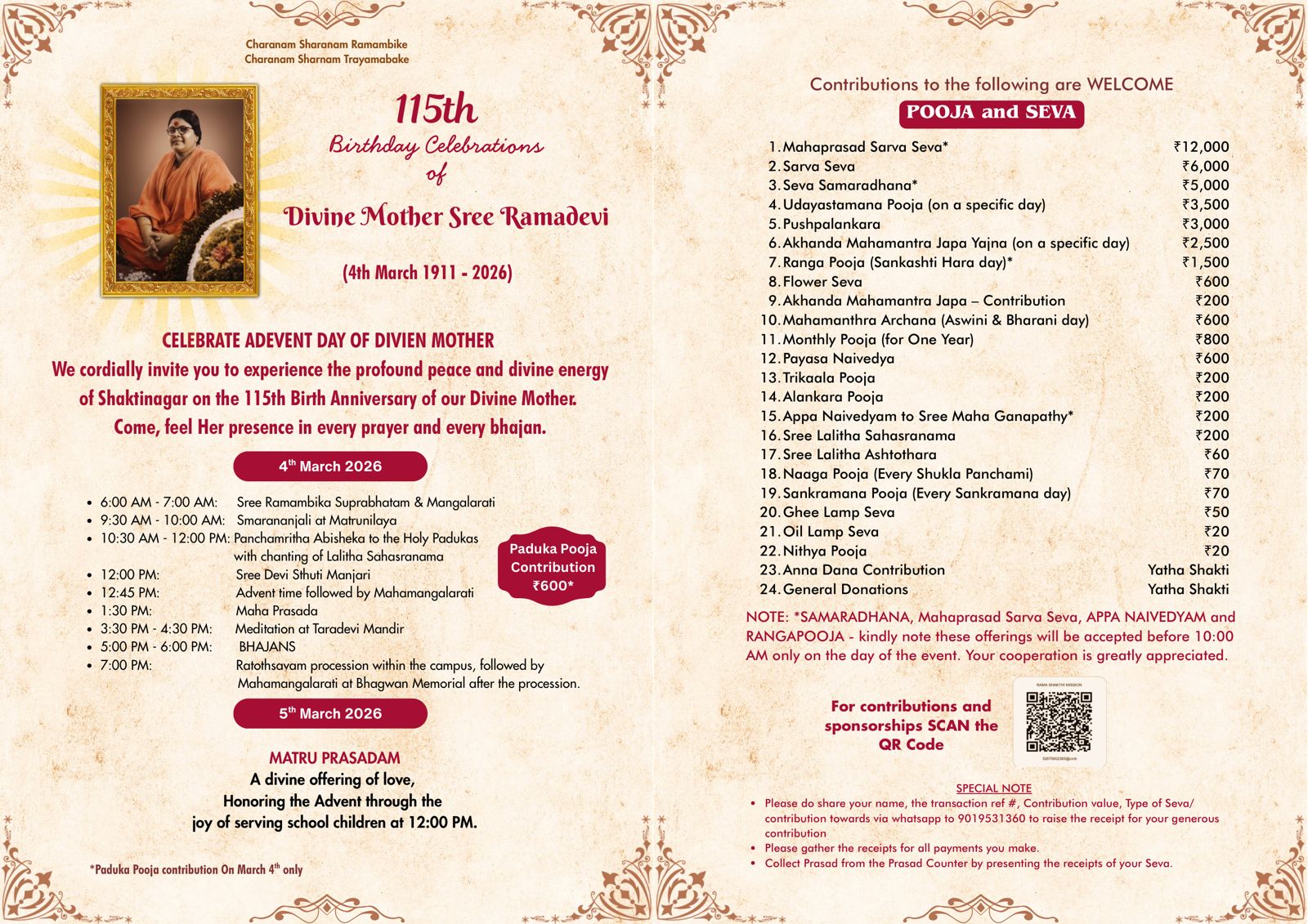 ತಾಯಿಯವರ ಅವತರಣ ದಿನದ ಈ ಶುಭ ಸಂದರ್ಭದಲ್ಲಿ ಭಕ್ತಾದಿಗಳಿಗಾಗಿ ಬೆಳಿಗ್ಗೆಯಿಂದ ಸಂಜೆಯವರೆಗೆ ವಿವಿಧ ಧಾರ್ಮಿಕ ಮತ್ತು ಸಾಂಸ್ಕೃತಿಕ ಕಾರ್ಯಕ್ರಮಗಳು ಜರುಗಲಿವೆ.