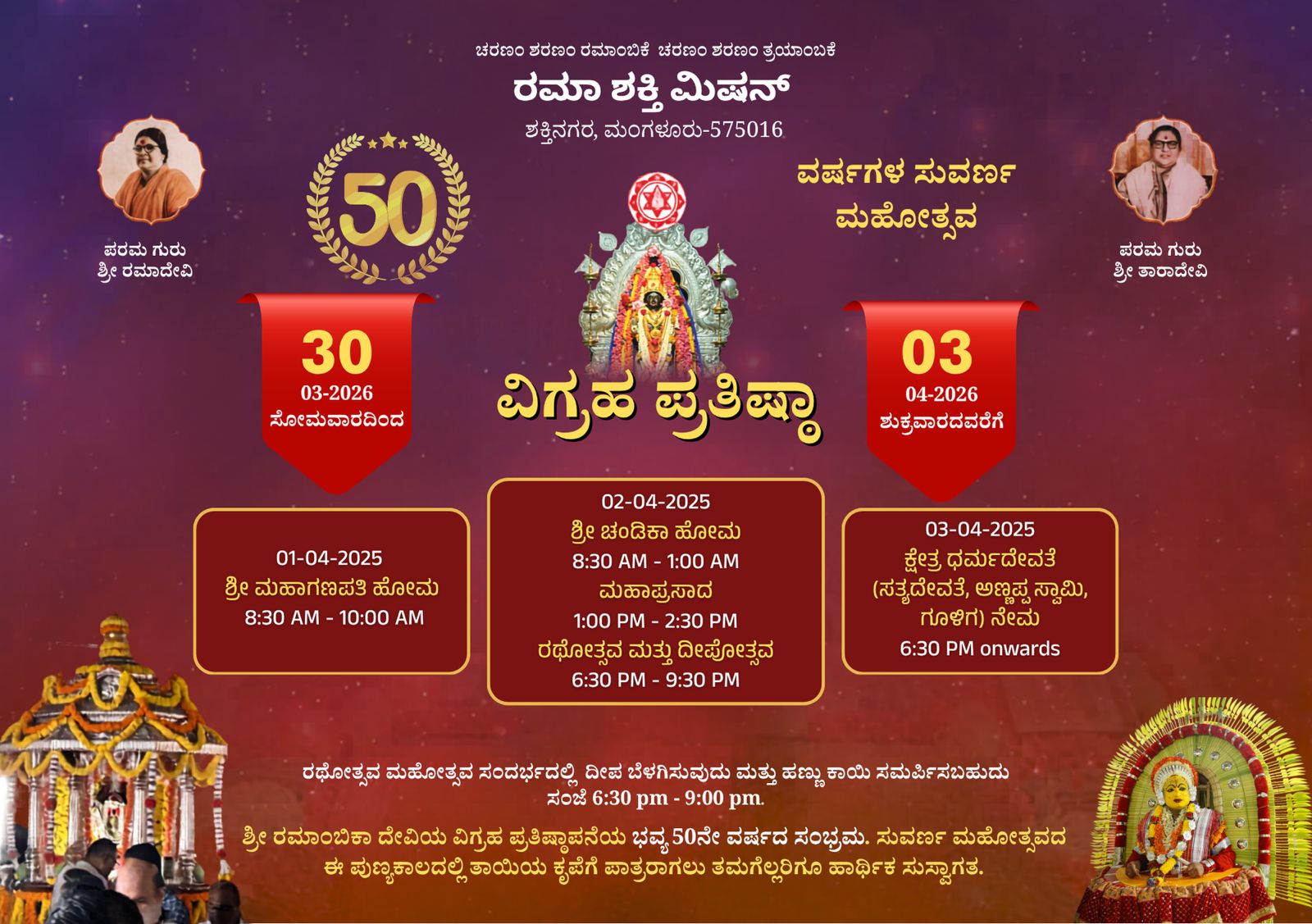 ರಮಾ ಶಕ್ತಿ ಮಿಷನ್ ಸಮಿತಿಯವರು ಪ್ರಕಟಣೆಯಲ್ಲಿ ತಿಳಿಸಿದಂತೆ, ಈ ಪವಿತ್ರ ಮಹೋತ್ಸವದಲ್ಲಿ ಭಕ್ತರು ಸಕುಟುಂಬ ಸಮೇತರಾಗಿ ಭಾಗವಹಿಸಿ ದೇವಿಯ ಕೃಪೆಗೆ ಪಾತ್ರರಾಗಬೇಕೆಂದು ಕೋರಲಾಗಿದೆ.